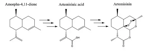 - ↑ Posthumus MA, Schmidt CO, De Kraker JW, Konig WA, Franssen MC (1999). "Amorpha-4,11-diene synthase catalyses the first probable step in artemisinin biosynthesis". Phytochemistry. 52 (5): 843–54. doi:10.1016/S0031-9422(99)00206-X. PMID 10626375.