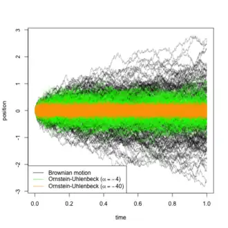 - Ornstein-Uhlenbeck process: in brief, an Ornstein-Uhlenbeck process is a continuous stochastic process that behaves like a Brownian motion, but attracted toward some central value, where the strength of the attraction increases with the distance from that value.[51][52][53] This is useful for modelling scenarios where the trait is subject to stabilizing selection around a certain value (say ). Under this model, the above-described transition of being in state to being in state would have a likelihood defined by the transition density of an Ornstein-Uhlenbeck process with two parameters: , which describes the variance of the driving Brownian motion, and , which describes the strength of its attraction to . As tends to , the process is less and less constrained by its attraction to and the process becomes a Brownian motion. Because of this, the models may be nested, and log-likelihood ratio tests discerning which of the two models is appropriate may be carried out.[50]