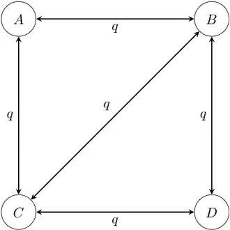 Example of a four-state 1-parameter Markov chain model. Note that in this diagram, transitions between states A and D have been disallowed; it is conventional to not draw the arrow rather than to draw it with a rate of 0. - Asymmetrical Markov -state 2 parameter model: in this model, the state space is ordered (so that, for example, state 1 is smaller than state 2, which is smaller than state 3), and transitions may only occur between adjacent states. This model contains two parameters and : one for the rate of increase of state (e.g. 0 to 1, 1 to 2, etc.), and one for the rate of decrease in state (e.g. from 2 to 1, 1 to 0, etc.).