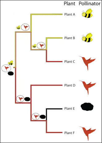 For example, consider a phylogeny recovered for a genus of plants containing 6 species A - F, where each plant is pollinated by either a "bee", "hummingbird" or "wind". One obvious question is what the pollinators at deeper nodes were in the phylogeny of this genus of plants. Under maximum parsimony, an ancestral state reconstruction for this clade reveals that "hummingbird" is the most parsimonious ancestral state for the lower clade (plants D, E, F), that the ancestral states for the nodes in the top clade (plants A, B, C) are equivocal and that both "hummingbird" or "bee" pollinators are equally plausible for the pollination state at the root of the phylogeny. Supposing we have strong evidence from the fossil record that the root state is "hummingbird". Resolution of the root to "hummingbird" would yield the pattern of ancestral state reconstruction depicted by the symbols at the nodes with the state requiring the fewest changes circled.