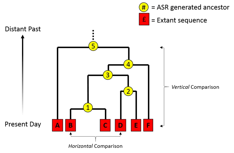 Unlike conventional evolutionary and biochemical approaches to studying proteins, i.e. the so-called horizontal comparison of related protein homologues from different branch ends of the tree of life; ASR probes the statistically inferred ancestral proteins within the nodes of the tree – in a vertical manner (see diagram, right). This approach gives access to protein properties that may have transiently arisen over evolutionary time and has recently been used as a way to infer the potential selection pressures that resulted in present-day sequences. ASR has been used to probe the causative mutation that resulted in a protein's neofunctionalization after duplication by first determining that said mutation was located between ancestors '5' and '4' on the diagram (illustratively) using functional assays.[6] In the field of protein biophysics, ASR has also been used to study the development of a protein's thermodynamic and kinetic landscapes over evolutionary time as well as protein folding pathways by combining many modern day analytical techniques such as HX/MS.[7] These sort of insights are typically inferred from several ancestors reconstructed along a phylogeny – referring to the previous analogy, by studying nodes higher and higher (further and further back in evolutionary time) within the tree of life.[8]