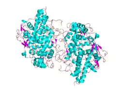 - 1 2 3 PDB: 1dnu; Blair-Johnson M, Fiedler T, Fenna R (November 2001). "Human myeloperoxidase: structure of a cyanide complex and its interaction with bromide and thiocyanate substrates at 1.9 A resolution". Biochemistry. 40 (46): 13990–7. doi:10.1021/bi0111808. PMID 11705390.