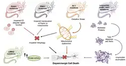 Leucine-rich repeat kinase (LRRK2) is a protein, that when mutated, is implicated in PD pathology. It is associated with both familial (most prevalent causes of familial PD) and sporadic PD. There are key mutations of the LRRK2 protein, like G2019s which is the most common missense mutation and R1441C/G.[14] Most studies have been conducted on C.elegans, Drosophila, and rodents (mice and rats). It is still unclear as to the mechanism of action of LRRK2, however, the kinase activity is of importance and its ability to function as a GTPase is also a factor in its neurotoxicity.[18] Unlike the other Parkinson's disease genetic models, LRRK2 can exhibit both Lewy body pathology and tau pathology, but it is also unclear as to its relationship.[18] On the other hand, results from LRRK2 mutation studies have demonstrated deficits in dopamine transmission, as well as axonal degeneration. Similar to other genetic animal models, LRRK2 mutations also produce dopaminergic neuron loss in the substantia nigra and Lewy body pathology. LRRK2 knockout models have also been studied and show the increase of protein aggregation and accumulation which also includes α-synuclein; but, it does not decrease degeneration of nigrostriatal neurons.[19] A limitation to the LRRK2 animal model is that although there is a loss in dopaminergic neurons, neurodegeneration is very low.