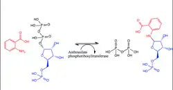 Anthranilate phosphoribosyltransferase (AnPRT) is a transferase enzyme which catalyses one of the most fundamental biochemical reactions: the transfer of a ribose group between an aromatic base and phosphate groups.[3] More specifically, AnPRT facilitates the formation of a carbon-nitrogen bond between 5-phospho-alpha-D-ribose 1-diphosphate (PRPP) and anthranilate.[3]