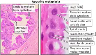 Apocrine metaplasia is a reversible transformation (metaplasia) of cells to an apocrine phenotype. It is common in the breast in the context of fibrocystic change. It is seen in women mostly over the age of 50 years. Metaplasia happens when there is an irritation to the breast (breast cyst). Apocrine-like cells form in a lining of developing microcysts, due to the pressure buildup within the lumen. The pressure build up is caused by secretions.[5] This type of metaplasia represents an exception to the common rule of metaplasia increasing the risk for developing cancer in that apocrine metaplasia doesn't increase the possibility of developing breast cancer.[6] Metaplastic apocrine cells belong to the category of oncocytes, which are a group characterized by abundant acidophilic, granular cytoplasm (from the Greek root onco-, which means mass, bulk).