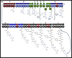 Apratoxin A comes from the Apratoxin biosynthetic pathway.[2] Figure 1 describes a proposed Biosynthetic pathway of Apratoxins. The Apratoxin biosynthetic pathway is an organization of type I modular mixed polyketide synthase/non-ribosomal peptide synthase (PKS/NRPS). Genetically, the 58kb biosynthetic gene cluster is composed of 12 open reading frames (ORFs), as shown in Figure 1.