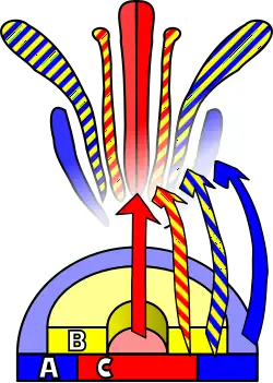 Observations of homeotic mutations led to the formulation of the ABC model of flower development by E. Coen and E. Meyerowitz.[62] According to this model, floral organ identity genes are divided into three classes - class A genes (which affect sepals and petals), class B genes (which affect petals and stamens), and class C genes (which affect stamens and carpels). These genes code for transcription factors that combine to cause tissue specification in their respective regions during development. Although developed through study of A. thaliana flowers, this model is generally applicable to other flowering plants.
