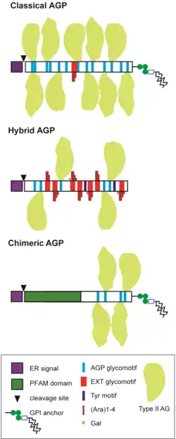 AGPs belong to large multigene families and are divided into several sub-groups depending on the predicted protein sequence.[11][4][12][13][2][14] "Classical" AGPs include the GPI-AGPs that consist of a signal peptide at the N-terminus, a PAST-rich sequence of 100-150 aa and a hydrophobic region at the C-terminus that directs addition of a GPI-anchor; non GPI-AGPs that lack the C-terminal GPI signal sequence, Lysine(K)-rich AGPs that contain a K-rich region within the PAST-rich backbone and AG-peptide that have a short PAST-rich backbone of 10-15 aa (Figure 2). Chimeric AGPs consist of proteins that have an AGP region and an additional region with a recognised protein family (Pfam) domain. Chimeric AGPs include fasciclin-like AGPs (FLAs), phytocyanin-like AGPs (PAGs/PLAs, also known as early-nodulin-like proteins, ENODLs) and xylogen-like AGPs (XYLPs) that contain lipid-transfer-like domains.[1] Several other putative chimeric AGP classes have been identified that include AG glycomotifs associated with protein kinase, leucine-rich repeat, X8, FH2 and other protein family domains.[2][15][16] Other non-classical AGPs exist such as those containing a cysteine(C)-rich domain, also called PAC domains, and/or histidine(H)-rich domain,[17][18] as well as many hybrid HRGPs that have motifs characteristic of AGPs and other HRGP members, usually extensin and Tyr motifs.[17][19][1][2][14] AGPs are evolutionarily ancient and have been identified in green algae as well as Chromista and Glaucophyta.[2][14][20] Found throughout the entire plant lineage, land plants are suggested to have inherited and diversified the existing AGP protein backbone genes present in algae to generate an enormous number of AGP glycoforms.