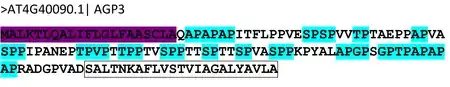 - ↑ PLA: phytocyanin-like AGP. ALGAL-CAM: algal cell adhesion molecule. ISG: inversion-specific glycoprotein. FLA: fasciclin like AGP. ENODL: earlt nodulation like. MF: male fertility. TTS: transmitting tissue specific. MTR: microspore and tapetum regulator. SOS: salt overly sensitive. XYP: xylogen protein. attAGP: attachment AGP.