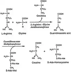 {{cite book}}:|work=ignored (help) - ↑ Wyss M, Kaddurah-Daouk R (July 2000). "Creatine and creatinine metabolism". Physiol. Rev. 80 (3): 1107–213. doi:10.1152/physrev.2000.80.3.1107. PMID 10893433.