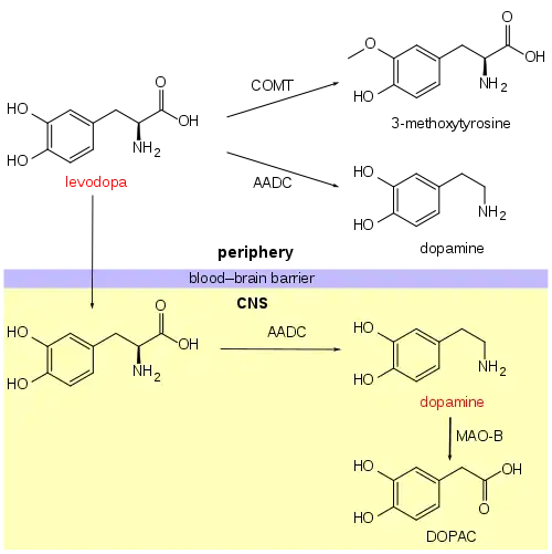 Peripherally selective DDCIs incapable of crossing the protective blood–brain barrier (BBB) are used in augmentation of L-DOPA (levodopa) in the treatment of Parkinson's disease (PD) to block the conversion of L-DOPA into dopamine outside the brain, for the purpose of reducing adverse side effects.[3] Combined L-DOPA and DDCI therapy does not inherently decrease peripheral cardiovascular side effects of L-DOPA administration; however, combined therapy potentiates the central effects of L-DOPA by decreasing the dose-dependency 4-5 fold, therein allowing for effective Parkinson's disease treatment without cardiovascular risk associated with high peripheral dopamine.[4][5]