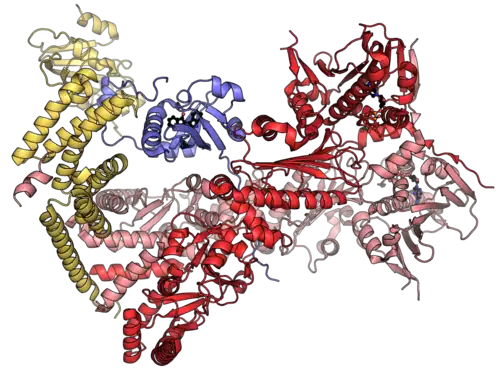 Complex of the aryl hydrocarbon receptor (AhR, blue), AhR-interacting protein (XAP2, yellow) and heat shock protein 90-beta (Hsp90, red). AhR and Hsp90 are bound to indirubin and ADP, respectively.