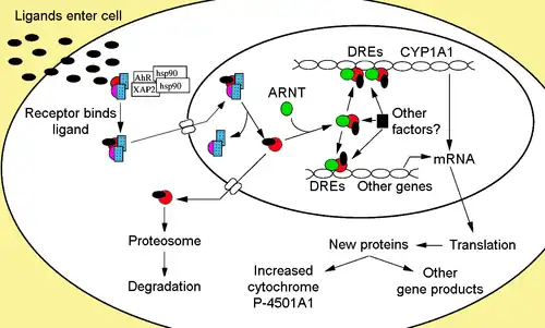 Upon ligand binding to AhR, AIP is released resulting in exposure of the NLS, which is located in the bHLH region,[47] leading to import into the nucleus.[48] It is presumed that once in the nucleus, Hsp90 dissociates exposing the two PAS domains allowing the binding of ARNT.[40][49][50][51] The activated AhR/ARNT heterodimer complex is then capable of either directly or indirectly interacting with DNA by binding to recognition sequences located in the 5’- regulatory region of dioxin-responsive genes.[40][50][52]