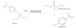 The products of the reaction are diethyl phosphoric acid and p-nitrophenol.[4] The latter product is further degraded by an enzyme encoded 750bp downstream of the opd gene, and encodes a 29kDa putative hydrolase that may be involved in degrading aromatic compounds, and works in concert with PTE.[4] This enzyme is homologous to hydrolases in Pseudomonas putida, Pseudomonas azelaica, Rhodococcus sp., and P. fluorescens.[4]