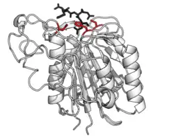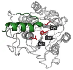 Legumain is a cysteine protease from the C13 family of the CD clan of proteases (MEROPS).[11] It uses a catalytic triad of Cysteine-Histidine-Asparagine in its active site to perform covalent proteolysis of its substrate.[3]