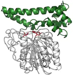 Human pro-legumain with catalytic triad in red, bound to its auto-inhibitory C-terminal prodomain in green. (PDB: 4FGU)