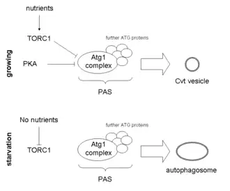 Atg1 can associate with a number of other proteins of the Atg family to form a complex that functions in autophagosome or Cvt vesicle formation. The initiation of autophagy involves the building of the pre-autophagosomal structure (PAS). Most Atg proteins accumulate at the PAS and generate either Cvt vesicles under normal growing conditions or autophagosomes under starvation.[2] To date, there are 31 ATG genes, which can be classified into several different groups according to their functions at the different steps of the pathway. 17 of these genes only work in the Cvt pathway.
