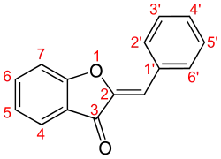 An aurone is a heterocyclic chemical compound, which is a type of flavonoid.[1] There are two isomers of the molecule, with (E)- and (Z)-configurations. The molecule contains a benzofuran element associated with a benzylidene linked in position 2. In aurone, a chalcone-like group is closed into a 5-membered ring instead of the 6-membered ring more typical of flavonoids.