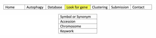 - A user may search for a gene by name in Look for gene category. A gene may be sought for using its gene symbol, Ensembl accession number, chromosome location, or a relevant keyword. Simple instructions for how to access a gene of interest using this method are given in the figure for "Look for gene: HADb". Briefly, the user would access the website, select the highlighted tab, and search for their gene of interest using the available tabs given in the associated image. Specifically, the user would select which option they would like to use in the associated table, and then fill in the information for the desired tab, whether it be Symbol or Synonym, Chromosome, Accession number, or Keyword. Once the tab is selected, information can be entered and searched to determine any linked autophagy-related proteins.