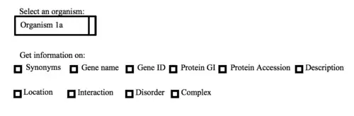 - the Protein list, highlighted yellow, where the user may select an organism and search for Synonyms, Gene ID, and Protein accession, among other functions. These function offer the user multiple options on how to search for information on genes of interest. The options available on Autophagy database for Protein list can be seen in the example given to the right Protein list given to the right. Selecting various options, such as Synonyms, allows the user to search using specific queries.