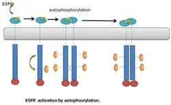 An example of RTKs that undergo autophosphorylation is the Epidermal Growth Factor receptor (EGFR). EGFR was the first discovered example of RTKs. Following ligand binding, a conformational change occurs in the EGFR monomers. This leads to EGFR dimerization.[21] Dimerization brings the two receptors into close proximity. This stimulates the kinase activity of EGFR, which leads to transautophosphorylation on multiple tyrosine residues in C-terminal end of the molecule. The phosphorylated tyrosine residue can then serve as a docking site for downstream signaling proteins.[21] (Fig. 1).