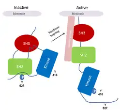 The Src-family kinases are examples of proteins that utilize autophosphorylation to sustain their activated states.[3] Src kinases are involved in intracellular signaling pathways that influence cell growth and cell adhesion strength. The latter contributes to the control of cell migration. In this way, src-kinase deregulation can enhance tumor growth and invasive potential of cancer cells.[2] The activity of src kinases is regulated by both phosphorylation and intramolecular interactions involving the SH2 and SH3 domains. The probable activation mechanism of src kinase in cancer is as follows: