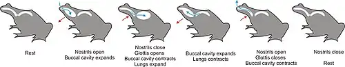 Axolotls have barely visible vestigial teeth, which develop during metamorphosis. The primary method of feeding is by suction, during which their rakers interlock to close the gill slits. External gills are used for respiration, although buccal pumping (gulping air from the surface) may also be used to provide oxygen to their lungs.[15] Buccal pumping can occur in a two-stroke manner that pumps air from the mouth to the lungs, and with four-stroke that reverses this pathway with compression forces.