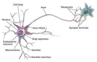 An axon is one of two types of cytoplasmic protrusions from the cell body of a neuron; the other type is a dendrite. Axons are distinguished from dendrites by several features, including shape (dendrites often taper while axons usually maintain a constant radius), length (dendrites are restricted to a small region around the cell body while axons can be much longer), and function (dendrites receive signals whereas axons transmit them). Some types of neurons have no axon and transmit signals from their dendrites. In some species, axons can emanate from dendrites known as axon-carrying dendrites.[1] No neuron ever has more than one axon; however in invertebrates such as insects or leeches the axon sometimes consists of several regions that function more or less independently of each other.[2]