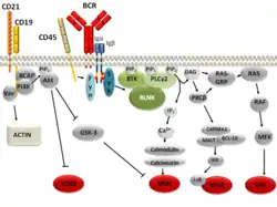 - ↑ Hendriks RW, Kersseboom R (February 2006). "Involvement of SLP-65 and Btk in tumor suppression and malignant transformation of pre-B cells". Seminars in Immunology. 18 (1): 67–76. doi:10.1016/j.smim.2005.10.002. PMID 16300960.