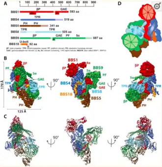 It was discovered by Maxence Nachury, Alexander Loktev, and several other associates in a study performed in 2007 that used biochemical purification of complexes that contained BBS4 in mammalian cells.[4][2] The researchers identified BBSome localization to both centriolar satellites in the cytoplasm and the membrane of the cilia, the importance of the BBSome concerning IFT, and the mechanism for delivery to the cilia via centriolar satellites.[4] They hypothesized that the BBSome was transported to the basal body by centriolar satellites, which are cytoplasmic granules that bring specific proteins to the centrosome due to its connection to PCM-1.[4] They proposed the use of centriolar satellites to transport the BBSome was to function in a chaperone-like manner to limit BBSome activity to the basal body.[4] The researchers noticed that BBS4 interacts with PCM-1, a core component of centriolar satellites, and helps bring proteins to the centrosome.[4][2] Then, the BBSome can dissociate from PMC-1 and perform its function in the basal body or within the primary cilia.[4] The researchers believed the complex consisted of seven proteins (BBS1, BBS2, BBS4, BSS5, BBS7, BBS8, and BBS9).[4] They also discovered the relationship between the subunits of interactions of BBS1/BBS2/BBS7 with β-propeller domains, BBS4/BBS8 with TPR (tetratricopeptide repeat) regions, BBS3/Arl6, and BBS6/BBS10/BBS12 relations for chaperonin-like functions.[4] They noticed that BBS9 interacted with several other subunits like BBS1, BBS2, BBS4, BBS5, and BBS8, so they proposed that it was located in the center of the complex.[4] They also noticed how the BBSome function was linked to Rabin8, a protein that localizes the basal body and attracts the BBSome protein BBS1.[4] The scientists then looked at BBS5 to determine the areas of the BBSome that function in lipid binding and noticed how the binding of phosphoinositides might be essential for ciliogenesis.[4] Arl6's crystal structure allowed for high-resolution structural information on the BBSome subunits to be collected when the BBSome is active (Arl6 bound).[14] High-resolution cryo-electron microscopy with an average of 3.8 Å was used to display the overall complex structure, but it did not allow for an accurate atomic model due to limited resolution.[1] Only approximately 80% of the complex could be described using an atomic model.[1] Due to the relatively recent discovery of the protein complex, there is still a lot about the mechanism in which it functions that remain unknown. The identity of which cilia membrane proteins require the BBSome, the molecular and/or enzymatic activity of the complex, the specific function of BBS proteins that are not within the BBSome, as well as many other questions still need to be answered for the complete understanding of what the BBSome is and how it functions.