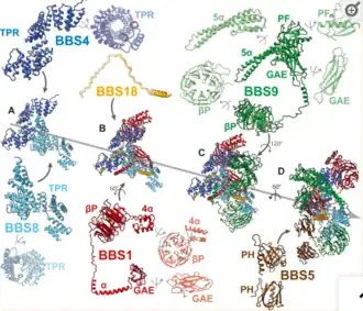 (A–E) The described order of addition of subunits has been chosen for visual clarity and does not reflect the sequential assembly in vivo. BBS4 and BBS8 are shown in two different views to visualize the superhelical arrangement of the TPR repeats. Likewise, domains of BBS1 and BBS9 are also shown individually in two views.[16]