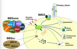 A BBSome is a protein complex that operates in primary cilia biogenesis, homeostasis, and intraflagellar transport (IFT).[1] The BBSome recognizes cargo proteins and signaling molecules like G-protein coupled receptors (GPCRs) on the ciliary membrane and helps transport them to and from the primary cilia.[2][3] Primary cilia are nonmotile microtubule projections that function like antennae and are found in many types of cells.[4][2] They receive various environmental signals to aid the cell in survival. They can detect photons by concentrating rhodopsin, a light receptor that converts photons into chemical signals, or odorants by concentrating olfactory receptors on the primary cilia surface.[5] Primary cilia are also meaningful in cell development and signaling.[1] They do not contain any way to make proteins within the primary cilia, so the BBSome aids in transporting essential proteins to, from, and within the cilia.[1] Examples of cargo proteins that the BBSome is responsible for ferrying include smoothened (a component of the Hedgehog signaling pathway), polycystic-1 (PC1), and several G-Protein coupled receptors (GPCRs) like somatostatin receptors (Sstr3), melanin-concentrating hormone receptor 1 (Mchr1), and neuropeptide Y2 receptor.[6][7]