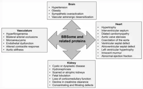 BBSome activity has recently been expanded to systems other than primary cilia transports and has been connected to renal, neuronal, vascular, and cardiac development, regulation, and function.[7] The expression of BBS genes were seen in different tissues that relate to blood pressure, cardiovascular function, and renal activity.[7] Mutations in the BBS genes will also result in Bardet-Biedl Syndrome. Ciliary BBSomes can affect obesity levels, ciliary BBSomes in nephronal tissue can affect kidney health, neuronal BBSomes can play an important role in regulating blood pressure, and BBSomes in vascular and cardiac cells can also affect arterial pressure and heart development.[26][27][28] All of these effects are seen in patients with BBS, but BBS gene polymorphism can be associated with complications in blood pressure, body weight, and other cardiovascular factors in patients that do not have BBS.[29][30]