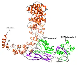 BEND2 has two BEN domains at its C-terminus.[3] BEN domains are found in a diverse array of proteins and are predicted to be important for chromatin remodeling as well as for the recruitment of chromatin-modifying factors utilized during the process of transcriptional regulation of gene expression.[7] BEN domains are predicted to form four alpha helices that allow this domain to interact with its DNA target.[7][22]