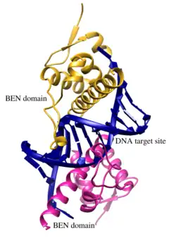 - 1 2 3 Dai Q, Ren A, Westholm JO, Serganov AA, Patel DJ, Lai EC (March 2013). "The BEN domain is a novel sequence-specific DNA-binding domain conserved in neural transcriptional repressors". Genes & Development. 27 (6): 602–14. doi:10.1101/gad.213314.113. PMC 3613608. PMID 23468431.