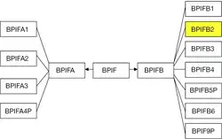 Genes for the BPI/LBP/PLUNC superfamily are found in all vertebrate species, including distant homologs in non-vertebrate species such as insects, mollusks, and roundworms.[9][10] Within that broad grouping is the BPIF gene family whose members encode the BPI fold structural motif and are found clustered on a single chromosome, e.g., Chromosome 20 in humans, Chromosome 2 in mouse, Chromosome 3 in rat, Chromosome 17 in pig, Chromosome 13 in cow. The BPIF gene family is split into two groupings, BPIFA and BPIFB. In humans, BIPFA consists of 3 protein encoding genes BPIFA1, BPIFA2, BPIFA3, and 1 pseudogene BPIFA4P; while BPIFB consists of 5 protein encoding genes BPIFB1, BPIFB2, BPIFB3, BPIFB4, BPIFB6 and 2 pseudogenes BPIFB5P, BPIFB9P. What appears as pseudogenes in humans may appear as fully functional genes in other species.