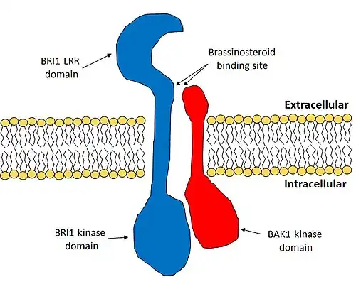 BAK1 was initially identified for its role in brassinosteroid signalling.[3] Brassinosteroid is a major plant hormone that has many roles and is often associated with cell elongation.[1] BAK1 binds to the brassinosteroid receptor BRASSINOSTEROID INSENSITIVE 1 (BRI1) and this then triggers a phosphorylation cascade that leads to a change in expression of multiple genes.[3]