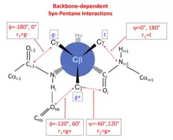 The effect of backbone conformation on side-chain rotamer frequencies is primarily due to steric repulsions between backbone atoms whose position is dependent on φ and ψ and the side-chain γ heavy atoms (carbon, oxygen, or sulfur) of each residue type (PDB atom types CG, CG1, CG2, OG, OG1, SG). These occur in predictable combinations that depend on the dihedrals connecting the backbone atoms to the side-chain atoms.[11][3] These steric interactions occur when the connecting dihedral angles form a pair of dihedral angles with values {-60°,+60°} or {+60°,-60°}, in a manner related to the phenomenon of pentane interference. For example, the nitrogen atom of residue i+1 is connected to the γ heavy atom of any side chain by a connected set of 5 atoms: N(i+1)-C(i)-Cα(i)-Cβ(i)-Cγ(i). The dihedral angle N(i+1)-C(i)-Cα(i)-Cβ(i) is equal to ψ+120°, and C(i)-Cα(i)-Cβ(i)-Cγ(i) is equal to χ1-120°. When ψ is -60° and χ1 is +60° (the g+ rotamer of a side chain), there is a steric interaction between N(i+1) and Cγ because the dihedral angles connecting them are N(i+1)-C(i)-Cα(i)-Cβ(i) = ψ+120° = +60°, and C(i)-Cα(i)-Cβ(i)-Cγ(i) = χ1-120° = -60°. The same interaction occurs when ψ is 0° and χ1 is 180° (the trans rotamer of a side chain). The carbonyl oxygen of residue i plays the same role when ψ=-60° for the g+ rotamer and when ψ=180° for the trans rotamer. Finally, φ-dependent interactions occur between the side-chain γ heavy atoms in g- and g+ rotamers on the one hand, and the carbonyl carbon of residue i-1 and a γ heavy atom, and between the backbone NH of residue i and its hydrogen-bonding partner on the other.