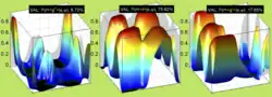 Many modeling programs, such as Rosetta, use a backbone-dependent rotamer library as a scoring function (usually in the form E=-ln(p(rotamer(i) | φ,ψ)) for the ith rotamer, and optimize the backbone conformation of proteins by minimizing the rotamer energy with derivatives of the log probabilities with respect to φ,ψ.[7] This requires smooth probability functions with smooth derivatives, because most mathematical optimization algorithms use first and sometimes second derivatives and will get stuck in local minima on rough surfaces. In 2011, Shapovalov and Dunbrack published a smoothed backbone-dependent rotamer library derived from kernel density estimates and kernel regressions with von Mises distribution kernels on the φ,ψ variables.[8] The treatment of the non-rotameric degrees of freedom (those dihedral angles not about sp3-sp3 bonds, such as asparagine and aspartate χ2, phenylalanine, tyrosine, histidine, tryptophan χ2, and glutamine and glutamate χ3) was improved by modeling the dihedral angle probability density of each of these dihedral angles as a function of χ1 rotamer (or χ1 and χ2 for Gln and Glu) and φ,ψ. The functions are essentially regressions of a periodic probability density on a torus.