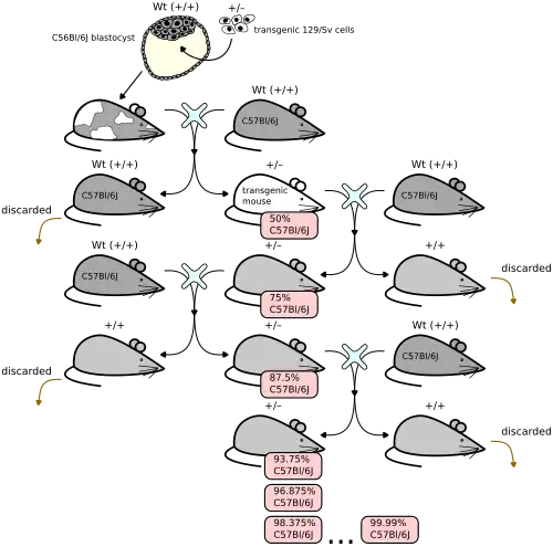 Backcrossing may be deliberately employed in animals to transfer a desirable trait in an animal of inferior genetic background to an animal of preferable genetic background. In gene-knockout experiments in particular, where the knockout is performed on easily cultured stem cell lines, but is required in an animal with a different genetic background, the knockout animal is backcrossed against the animal of the required genetic background. As the figure shows, each time that the mouse with the desired trait (in this case the lack of a gene (i.e. a knockout), indicated by the presence of a positive selectable marker) is crossed with a mouse of a constant genetic background, the average percentage of the genetic material of the offspring that is derived from that constant background increases. The result, after sufficient reiterations, is an animal with the desired trait in the desired genetic background, with the percentage of genetic material from the original stem cells reduced to a minimum (on the order of 0.01%).[3]