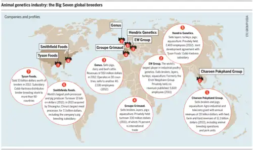 - ↑ ETC Group, Putting the Cartel before the Horse ... and Farm, Seeds, Soil, Peasants, etc. , page 17, chapter: Livestock Genetic, September 2013