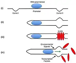 H-NS is about 15.6 kDa and assists in the regulation of bacterial transcription in bacteria by repressing and activating certain genes. H-NS binds to DNA with an intrinsic curvature. In E. coli, H-NS binds to a P1 promoter decreasing rRNA production during stationary and slow growth periods. RNA polymerase and H-NS DNA binding protein have overlapping binding sites; it is thought that H-NS regulates rRNA production by acting on the transcription initiation site. It has been found that H-NS and RNA polymerase both bind to the P1 promoter and form a complex. When H-NS is bound with RNA Polymerase to the promoter region, there are structural differences in the DNA that are accessible.[11] It has also been found that H-NS can affect translation as well by binding to mRNA and causing its degradation.