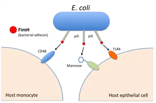 - 1 2 3 Tchesnokova V, Aprikian P, Kisiela D, et al. (October 2011). "Type 1 fimbrial adhesin FimH elicits an immune response that enhances cell adhesion of Escherichia coli". Infect. Immun. 79 (10): 3895–904. doi:10.1128/IAI.05169-11. PMC 3187269. PMID 21768279.