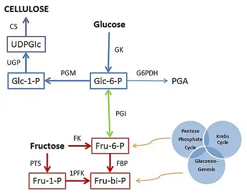 The synthesis of bacterial cellulose is a multistep process that involve two main mechanisms: the synthesis of uridine diphosphoglucose (UDPGIc), followed by the polymerization of glucose into long and unbranched chains (the β-1→4 glucan chain) by cellulose synthase. Specifics on the cellulose synthesis has been extensively documented.[12][13] The former mechanism is well known while the latter still needs exploring. The production of UDPGIc starts with carbon compounds (such as hexoses, glycerol, dihydroxyacetone, pyruvate, and dicarboxylic acids) entering the Krebs cycle, gluconeogenesis, or the pentose phosphate cycle depending on what carbon source is available. It then goes through phosphorylation along with catalysis, followed by isomerization of the intermediate, and a process known as UDPGIc pyrophosphorylase to convert the compounds into UDPGIc, a precursor to the production of cellulose. The polymerization of glucose into the β-1→4 glucan chain has been hypothesized to either involve a lipid intermediate[14] or not to involve a lipid intermediate,[12] though structural enzymology studies and in vitro experiments indicate that polymerization can occur by direct enzymatic transfer of a glucosyl moiety from a nucleotide sugar to the growing polysaccharide.[15] A. xylinum usually converts carbon compounds into cellulose with around 50% efficiency.[14]