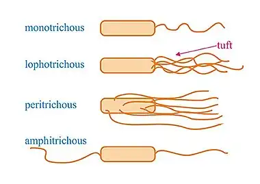 Different types of cell flagellation are found depending on the number and arrangement of the flagella on the cell surface, e.g., only at the cell poles or spread over the cell surface.[23] In polar flagellation, the flagella are present at one or both ends of the cell: if a single flagellum is attached at one pole, the cell is called monotrichous; if a tuft of flagella is located at one pole, the cells is lophotrichous; when flagella are present at both ends, the cell is amphitrichous. In peritrichous flagellation, the flagella are distributed in different locations around the cell surface. Nevertheless, variations within this classification can be found, like lateral and subpolar—instead of polar—monotrichous and lophotrichous flagellation.[24][3]