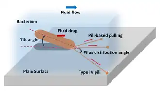 A bacterial biofilm is a bacterial community attached into a surface through extracellular polymeric materials.[71] Prior to biofilm formation, bacteria may need to deposit on the surface from their planktonic state. After bacteria deposit on surfaces they may "twitch" or crawl over the surface using appendages called type IV pili to "explore" the substratum to find suitable sites for growth and thus biofilm formation.[72][73][74][75] Pili emanate from bacterial surface and they can be up to several micrometres long (though they are nanometres in diameter).[76] Bacterial twitching occurs through cycles of polymerization and depolymerization of type IV pili.[77][78] Polymerization causes the pilus to elongate and eventually attaching into surfaces. Depolymerization makes the pilus retract and detach from the surfaces. Pili retraction produces pulling forces on the bacterium, which will be pulled in the direction of the vector sum of the pili forces, resulting in a jerky movement. A typical type IV pilus can produce a force exceeding 100 piconewtons [79] and then a bundle of pili can produce pulling forces up to several nanonewtons.[80] Bacteria may use pili not only for twitching but also for cell-cell interactions,[81][82] surface sensing,[83][84] and DNA uptake.[85][67]