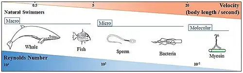 Here, ρ represents the density of the fluid; u is a characteristic velocity of the system (for instance, the velocity of a swimming particle); l is a characteristic length scale (e.g., the swimmer size); and μ is the viscosity of the fluid. Taking the suspending fluid to be water, and using experimentally observed values for u, one can determine that inertia is important for macroscopic swimmers like fish (Re = 100), while viscosity dominates the motion of microscale swimmers like bacteria (Re = 10−4).[3]