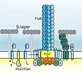 The bacterial flagellum is a protein-nanomachine that converts electrochemical energy in the form of a gradient of H+ or Na+ ions into mechanical work.[26][27][28] The flagellum is composed of three parts: the basal body, the hook, and the filament. The basal body is a reversible motor that spans the bacterial cell envelope. It is composed of the central rod and several rings: in Gram-negative bacteria, these are the outer L-ring (lipopolysaccharide) and P-ring (peptidoglycan), and the inner MS-ring (membrane/supramembrane) and C-ring (cytoplasmic). In Gram-positive bacteria only the inner rings are present.[29] The Mot proteins (MotA and MotB) surround the inner rings in the cytoplasmic membrane; ion translocation through the Mot proteins provide the energy for flagella rotation.[26] The Fli proteins allow reversal of the direction of rotation of the flagella in response to specific stimuli.[30][31] The hook connects the filament to the motor protein in the base. The helical filament is composed of many copies of the protein flagellin, and it can rotate clockwise (CW) and counterclockwise (CCW).[32][33][34][35][3]