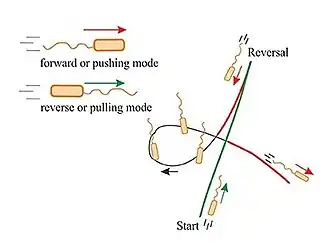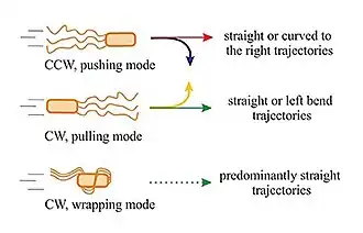 In the pushing mode, the rotating flagella (assembled in a bundle or as an open tuft of individual filaments) drive the motion from the rear end of the cell body. The trajectories are either straight or, in the vicinity of a solid surface, curved to the right, due to hydrodynamic interaction of the cell with the surface. The direction of curvature indicates that pushers are driven by a left-handed helix turning in CCW direction. In the pulling mode, the rotating flagellar bundle is pointing ahead. In this case the trajectories are either straight or with a tendency to bend to the left, indicating that pullers swim by turning a left-handed helical bundle in CW direction. Finally, P. putida can swim by wrapping the filament bundle around its cell body, with the posterior pole pointing in the direction of motion. In that case, the flagellar bundle takes the form of a left-handed helix that turns in CW direction, and the trajectories are predominantly straight.[57][3]