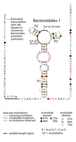 The Bacteroidales-1 RNA motif is a conserved RNA structure identified by bioinformatics.[1] It has been identified only in bacteria within the order (biology) Bacteroidales. Its presumed length is marked by a promoter on one end that conforms to an alternate consensus sequence that is common in the phylum Bacteroidota, and its 3′ end is indicated by predicted transcription terminators.[2] It is often located downstream of a gene that encodes the L20 ribosomal subunit, although it is unclear whether there is a functional reason underlying this apparent association.[1]